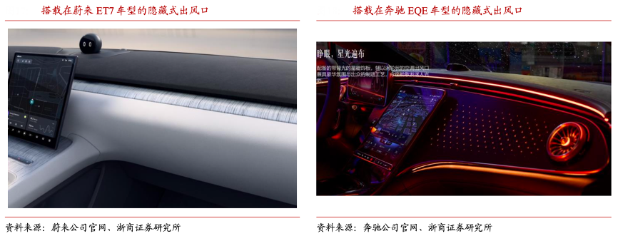 經典案例:根據蔚來公司官網、奔馳公司官網、浙商證券研究所等綜合資訊表明,香山股份探索創(chuàng)新新型出風口,個性化定制契合車型。為了加強公司在空氣管理系統(tǒng)行業(yè)的核心競爭力,緊跟新能源汽車行業(yè)發(fā)展,公司不斷拓展產業(yè)布局,開發(fā)新的產品,如隱藏式出風口、無感風出風口、貫穿氛圍燈出風口等 項目,致力實現(xiàn)人與座艙的智能交互。