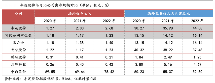 經(jīng)典案例:根據(jù)豐茂股份招股書、wind、證券時(shí)報(bào)CMR等資訊表明,豐茂股份公司作為橡膠傳動(dòng)帶行業(yè)龍頭之一,其橡膠帶傳動(dòng)系統(tǒng)產(chǎn)品在市場中具有較高的美譽(yù)度、知名度和明顯的競爭優(yōu)勢,先后榮獲“優(yōu)秀供應(yīng)商”、“質(zhì)量信得過供應(yīng)商”、 “傳動(dòng)帶行業(yè)八強(qiáng)企業(yè)”等榮譽(yù)。據(jù)招股書披露,公司出海規(guī)模居可比公司前列,2020-2022 年出海規(guī)模逐年遞增, 2022 年達(dá)到 2.68 億元,2020-2022 年公司海外營收貢獻(xiàn)度穩(wěn)定增長,2022 年達(dá)到44.08%。