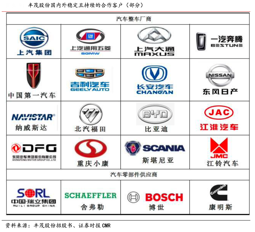 經(jīng)典案例:根據(jù)豐茂股份招股書、證券時(shí)報(bào)CMR等資訊表明,豐茂股份憑借產(chǎn)品品質(zhì)優(yōu)異、產(chǎn)品型號豐富、售后服務(wù)良好等優(yōu)勢,公司實(shí)現(xiàn)了較高的客戶滿意度及較強(qiáng)的行業(yè)影響力。公司已發(fā)展成為上汽集團(tuán)、一汽集團(tuán)、吉利汽車、長 安汽車、東風(fēng)日產(chǎn)、納威斯達(dá)等國內(nèi)外知名整車廠,以及瑞立集團(tuán)、康明斯、博世、LNDISTRIBUTION LLC、舍弗勒、邁樂、米其林等知名汽車零部件企業(yè)的合格供應(yīng)商,并與之建立了長期穩(wěn)定的合作關(guān)系。
