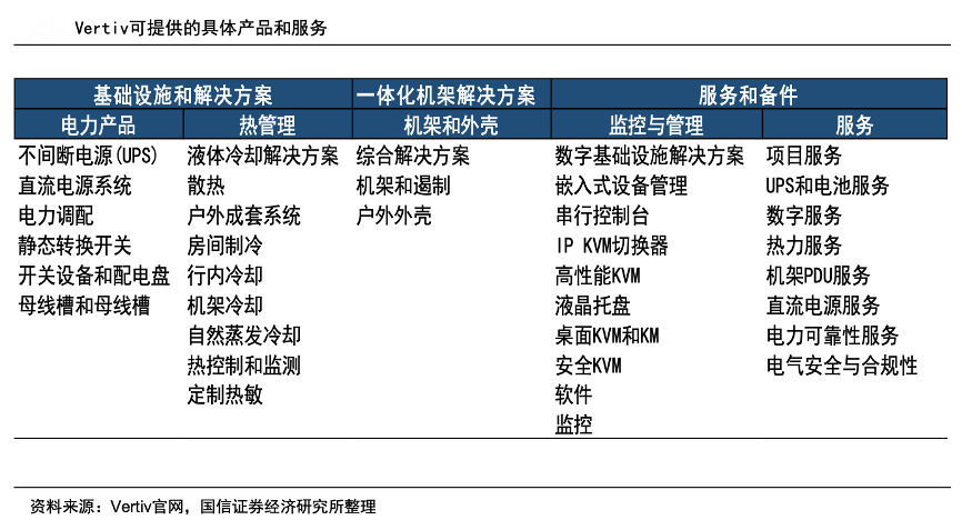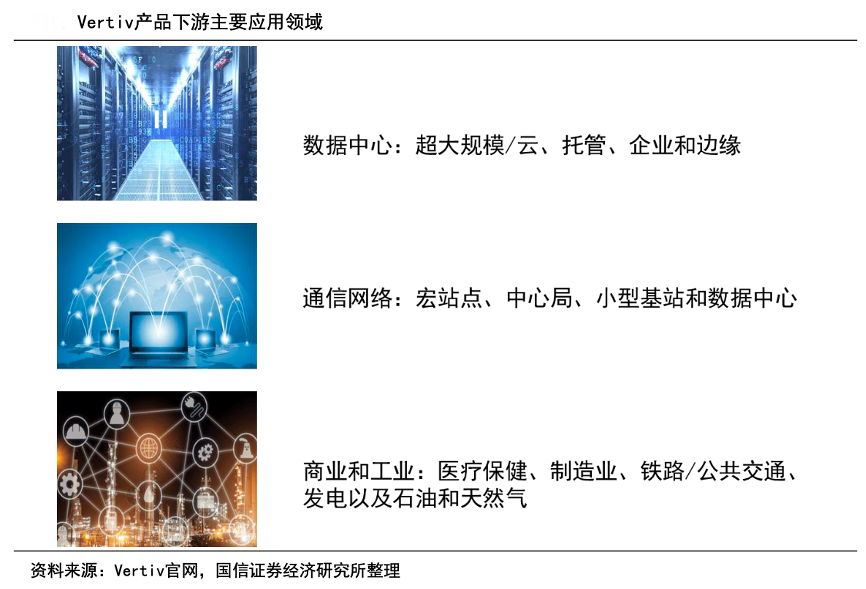 經典案例:根據Vertiv官網、國信證券經濟研究所等綜合資訊表明,Vertiv公司業務圍繞電力、冷卻和IT管理展開,下游主要涉及數據中心、通信網絡以及商業和工業環境三大領域。公司主要提供從云到網絡邊緣的電力、冷卻和IT基礎設施解決方案和服務,具體產品包括基礎設施和解決方案(交流和直流電源管理、熱管理、低/中壓開關設備、母 線槽和集成模塊化解決方案)等。