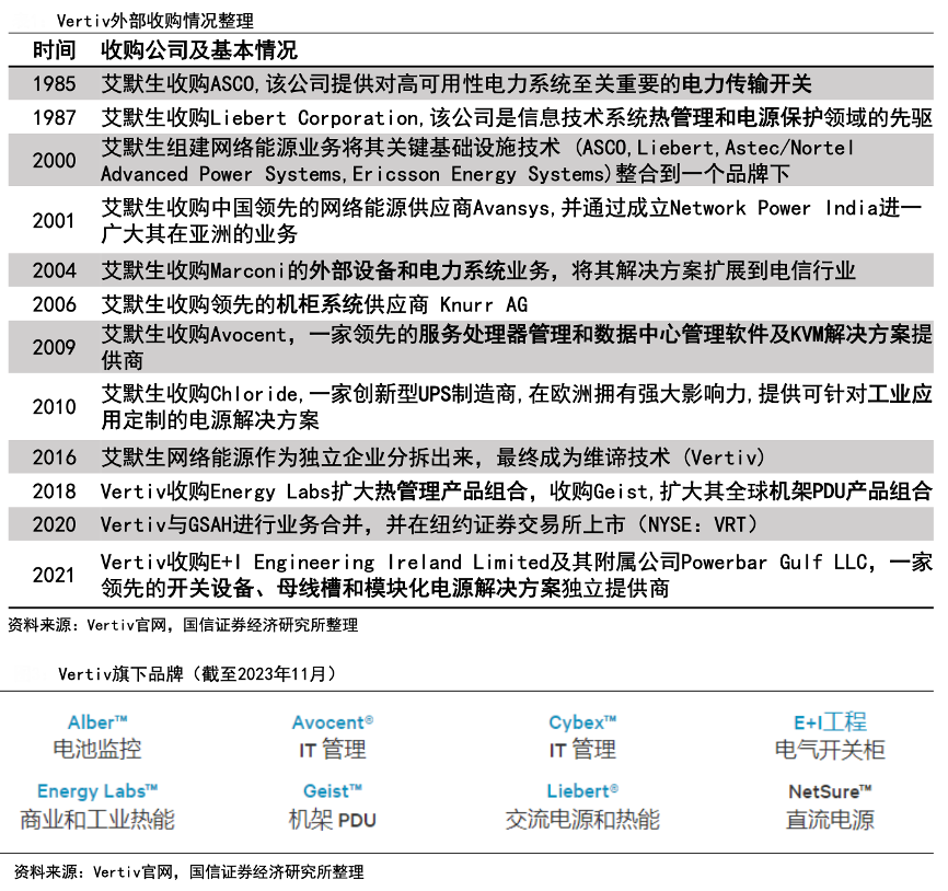 經(jīng)典案例:根據(jù)Vertiv官網(wǎng)、國信證券經(jīng)濟(jì)研究所等綜合資訊表明,Vertiv通過多次外部 收購,目前Vertiv旗下有8家子品牌,分別是Alber、 Avocent、Cybex、E+I、Energy Labs、Geist、Liebert以 及NetSure,擁有電力、冷卻到IT服務(wù)的一系列全方位品牌組合,在全球擁有200多個服務(wù)中心和3,500多名服務(wù)工程師。