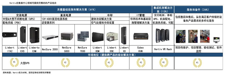 經(jīng)典案例:根據(jù)Vertiv官方材料、國信證券經(jīng)濟(jì)研究所等綜合資訊表明,在數(shù)據(jù)中心領(lǐng)域,Vertiv產(chǎn)品覆蓋了從電力系統(tǒng)、冷卻到服務(wù)等眾多環(huán)節(jié)。完整的產(chǎn)品組合意味著公司可以滿足客戶多樣化的數(shù)據(jù)中心部署 方案需求,競爭對手分散,而Vertiv是唯一能提供全套解決方案的廠商,其產(chǎn)品組合完備+產(chǎn)品實力領(lǐng)先推動公司保持第一。