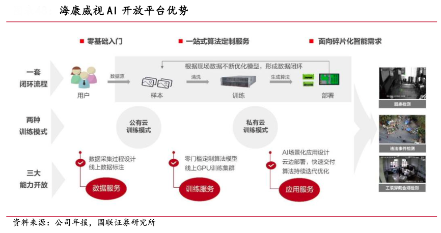經典案例:根據公司年報、國聯證券研究所等綜合資訊表明,??低?nbsp;AI 開放平臺自上線以來,吸引了來自教育、醫療、金融、零售、制造、交通等多個行業的用戶和合作伙伴,為各行業的智能化升級提供了強有力的支撐。截 至 2023 年 6 月 30 日,??低?nbsp;AI 開放平臺服務的中小微企業已經超過 2 萬家,生成模型超過 8 萬個,落地項目超過 1.4 萬個,企業成交用戶數超過了 1 萬家。