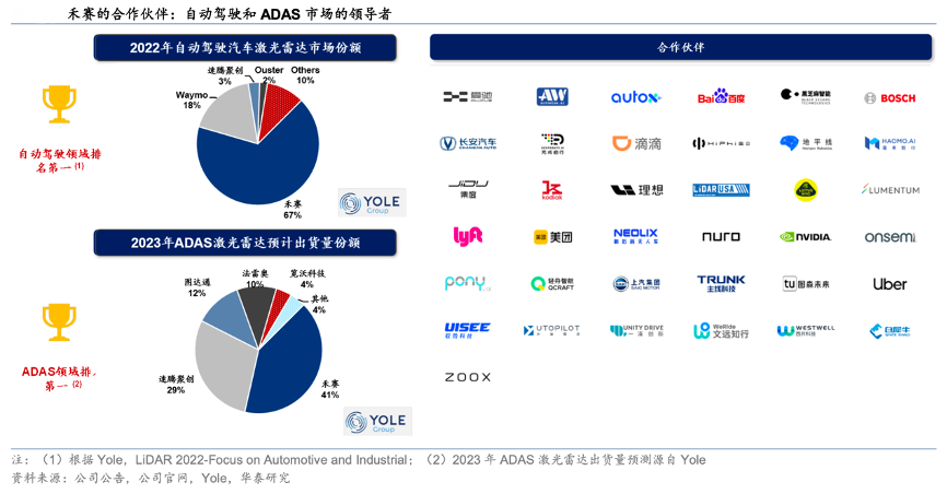 經典案例:根據公司公告、公司官網、YoLe、華泰研究等綜合資訊表明,在過去數年中,禾賽與汽車、自動駕駛和機器人應用龍頭建立了緊密的合作伙伴關系。在汽車領域,禾賽與博世、理想、長安、高合以及路特斯等多家行業領先的整車廠和科 技公司建立了一系列合作伙伴關系。在自動駕駛市場上,禾賽旗艦 Pandar 系列的客戶包括一家總部位于美國的全球整車廠龍頭以及 Zoox。據 Yole 的報告,禾賽 2022 年收入約占全球市場份額的47%。