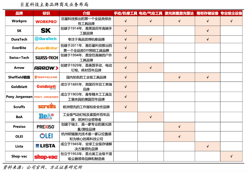 經典案例:根據公司官網、方正證券研究所等綜合資訊表明,目前,巨星科技公司已擁有多個全球知名百年品牌和工具細分行業龍頭品牌,涵蓋業務有手動工具、電動工具、氣動緊固工具、激光測量工具、激光雷達、箱柜存儲設備、 工業吸塵器等。