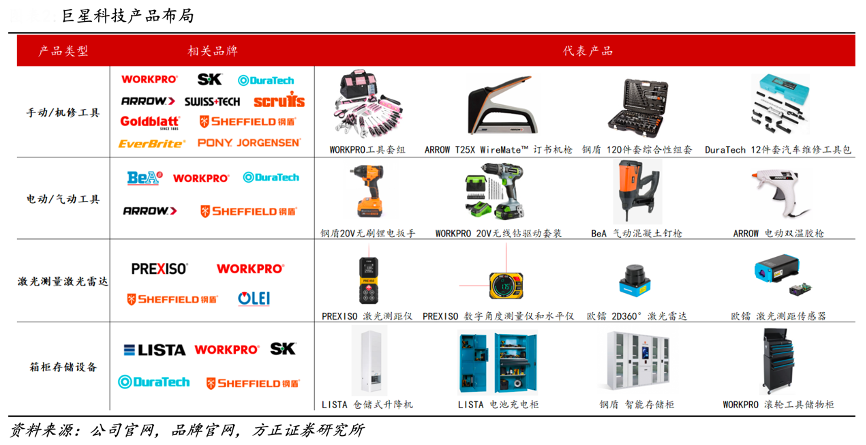 經典案例:根據公司官網、品牌官網、方正證券研究所等綜合資訊表明,巨星科技公司長期致力于自有品牌的打造和發展,同時通過收購細分領域知名品牌強化品牌優勢,持續擴大了公司品牌的銷售占比和市場占有率。目前,公司已經實現了較為完善的產業布局,產品矩陣逐漸完備。