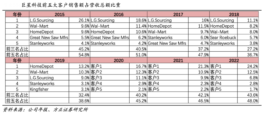 經典案例:根據公司年報、方正證券研究所等綜合資訊表明,目前,巨星科技公司已成為美國 HOME DEPOT、美國 WALMART、美國 LOWES、歐洲 Kingfisher、加拿大 CTC 等多家大型連鎖超市最大的工具和儲物柜(Tools and Storage)供應商之一,并不斷拓展新的產品品類。目前在全球范圍內,有 20000 家以上的大型五金、建材、汽配等連鎖超市同時銷售公司的各類產品。