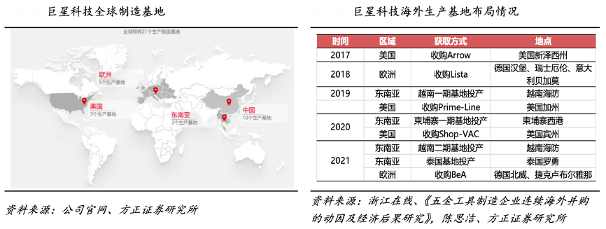 經典案例:根據公司官網、浙江在線、《五金工具制造企業連續海外并購的動因及經濟后果研究》、陳思潔、方正證券研究所等綜合資訊表明,目前巨星科技公司在全球擁有 20 處生產制造基地,主要通過“自主建廠+并購”的方式, 逐步建立起以亞太地區為核心,歐美產能為補充的全球化生產基地,能夠全面滿 足各類需求和應對各自復雜的外部環境。