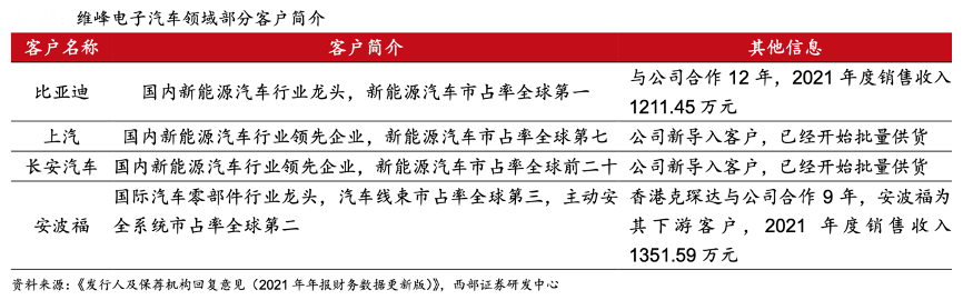 經(jīng)典案例:根據(jù)《發(fā)行人及保薦機構回復意見(2021年年報財務數(shù)據(jù)更新版)》、西部證券研發(fā)中心等綜合資訊表明,維峰電子公司依靠 K300、SDC、74040 等在性能方面已達到或接近國際一流廠商同等技術水 平的產品,較早進入了比亞迪的直供體系并形成先發(fā)優(yōu)勢,產品廣泛運用于漢、唐、秦、 宋及海洋系列以及大巴 K8、K9 系列。