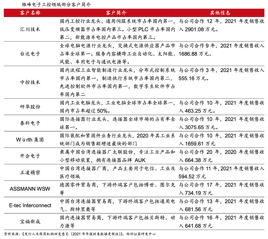 經(jīng)典案例:根據(jù)《發(fā)行人及保薦機構回復意見(2021年年報財務數(shù)據(jù)更新版)》、西部證券研發(fā)中心等綜合資訊表明,維峰電子公司通過持續(xù)深耕和銷售策略聚焦才逐步形成數(shù)量可觀的客戶量,大部分工控領域主要客戶與公司合作均超過 10 年。其中匯川技術作為國內工控行業(yè)龍頭,公司是其工業(yè)控制領域連接器第一大國產供應商。公司在工控領域的核心終端客戶主要為匯川技術、臺達電子、中控技術等,品牌商客戶主要包括泰科、Würth 集團等。2022 年以來, 公司持續(xù)突破珠海松下、天津霍尼韋爾等海外新客戶,2023 年進一步突破西門子,并形成批量化出貨。