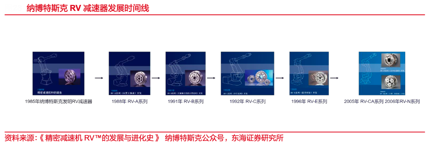 經典案例:根據《精密減速機RVTM的發展與進化史》納博特斯克公眾號、東海證券研究所等綜合資訊表明,納博特斯克充分利用自身在精密減速器領域的先發優勢,在現有產品的基礎上持續研發改進。自 1985 年 RV 減速器問世,納博特斯克已經對 RV 系列產品進行七次較大的迭代升級,推出 RV(原型機)、RV-A(內置主軸承)、RV-B(手腕軸 專用小型系列)、RV-C(中空系列)、RV-E(提升轉矩)、RV-CA(無中心齒輪)、RV-N(小 型、輕量化)等多系列產品,與在載荷、輕量化、小型化等方面取得突破,產品性能保持行業領先。