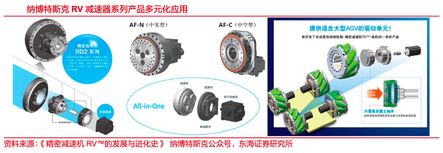 經典案例:根據《精密減速機RVTM的發展與進化史》納博特斯克公眾號、東海證券研究所等綜合資訊表明,納博特斯克將“動靜互換”作為自身核心技術, 注重新技術研發的同時持續拓寬應用落地。組件解決方案業務上,公司豐富 RV 減速器使用場景,針對精密機械制造、新能源等行業,陸續開發出工作臺齒輪頭、風電偏航與變槳驅動 裝置、光伏定日鏡驅動跟蹤裝置等新產品。