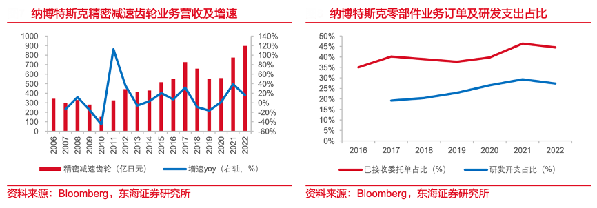 經(jīng)典案例:根據(jù)Bloomberg、東海證券研究所等綜合資訊表明,近年來納博特斯克進(jìn)一步強(qiáng)調(diào)制動技術(shù)為核心, 在機(jī)電一體化、運動控制方向持續(xù)加大投入,由部件銷售型向解決方案提供型轉(zhuǎn)化。其營收占比由 2016 年成立時的 33.67%,提升至 2022 年的 45.56%,成為第一大營收來源。部門研發(fā)投入與訂單占比穩(wěn)步提升,2022 年分別達(dá) 27.3% 與 44.5%,較 2017 年分別提升 8.09pct 與 4.40pct。