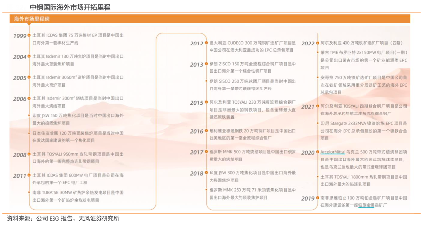 經(jīng)典案例:根據(jù)公司ESG報(bào)告、天風(fēng)證券研究所等綜合資訊表明,2019 年至 2022 年底,中鋼國際公司海外已執(zhí)行項(xiàng)目合同額達(dá) 150.60 億美元(已完成 134 億美元),90%的海外簽約額來自“一帶一路”沿線國家。目前在阿爾及利亞、南非、玻利維亞、土耳其、俄羅斯等國家承建冶金項(xiàng)目,其中包括阿爾及利亞四期短流程綜合鋼廠、玻利維亞首個(gè)綜合鋼廠、土耳其 1800mm 熱連軋、俄羅斯 40 年來最大規(guī)模的焦化項(xiàng)目等。