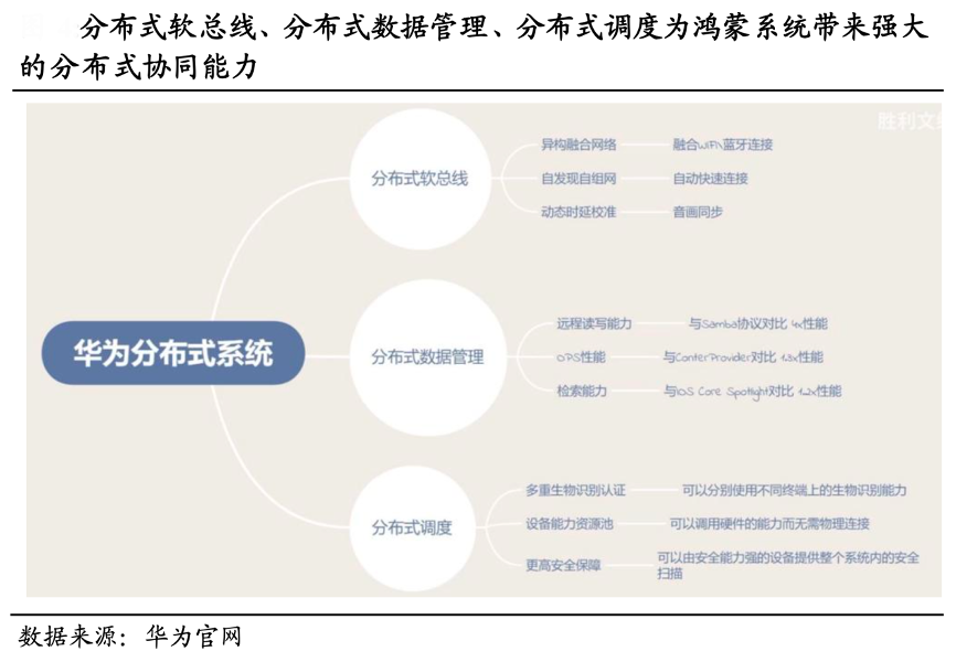 經典案例:根據華為官網、國泰君安證券研究等綜合資訊表明,傳統的操作系統都局限在單個硬件內部,鴻蒙系統通過引入分布式軟總線、分布式數據管理及分布式任務調度三大系統基礎能力,為各類鴻蒙終端帶來一套高效穩定的通信機制,實現了應用及數據在不同設備終端之間幾乎不中斷的自由遷移。