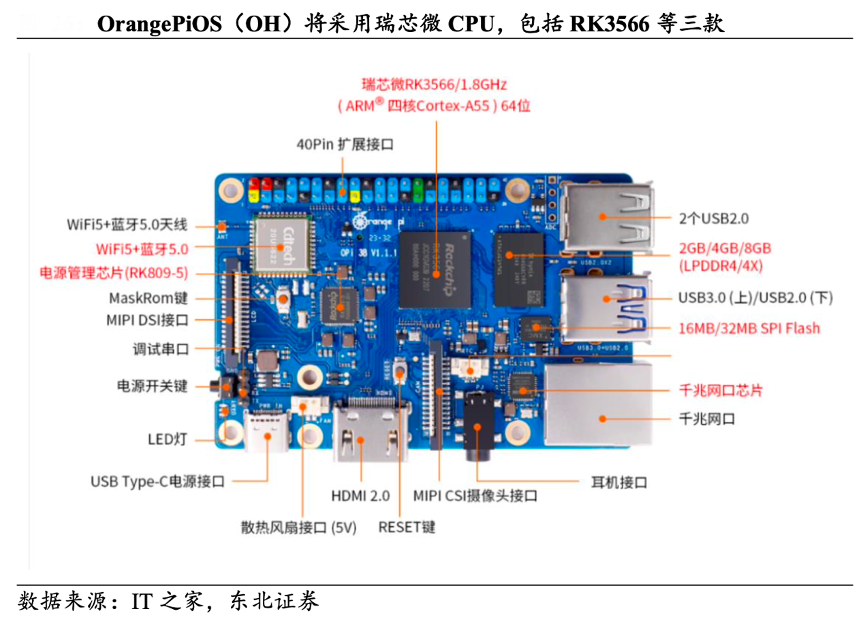 經(jīng)典案例:根據(jù)IT之家、東北證券等綜合資訊表明,基于 OpenHarmony 定制研發(fā)的 OrangePiOS(OH)將采用瑞芯微 CPU,其有望與 PC 鴻蒙協(xié)同發(fā)展。根據(jù)官方計(jì)劃,OrangePiOS(OH)將首先適配三款設(shè)備,均采 用 ARM 架構(gòu)的 CPU,分別是瑞芯微的 RK3566、RK3588、RK3588S。瑞芯微的這 三款 SoC 均是基于國(guó)產(chǎn) 22nm 工藝,內(nèi)置 0.8Tops 算力的 AI 加速器 NPU。