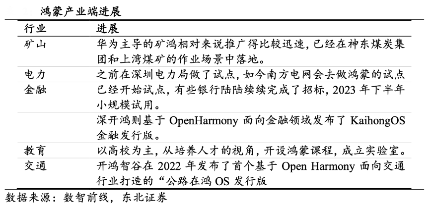 經(jīng)典案例:根據(jù)數(shù)智前線、東北證券等綜合資訊表明,鴻蒙在產(chǎn)業(yè)端的開(kāi)拓與華為軍團(tuán)緊密配合。華為之前成立的十幾個(gè)軍團(tuán),也是鴻蒙進(jìn)展比較快的領(lǐng)域。2022 年,包括各大 ISV 在內(nèi)的第三方伙伴基于 Open Harmony 發(fā)布了 23 個(gè)特定行業(yè)的商業(yè)發(fā)行版,已有 79 款商用終端設(shè)備落地,擴(kuò)展到了教育、金融、交通、政務(wù)、工業(yè)等領(lǐng)域。