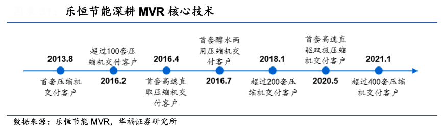 經典案例:根據樂恒節能MVR、華福證券研究所等綜合資訊表明,樂恒節能從成立之初就立足于 MVR 的核心技 術蒸汽壓縮機并實現了自主研發,其已圍繞 MVR 中藥濃縮系統申請授權專利 7 項,發明專利 2 項,其中“高效直驅滾動軸承同步電機式蒸汽壓縮機”技術填補了國內空白。自 2013 年 8 月交付客戶首套壓縮機開始,公司到 2021 年初已交付給客戶超過 400 套壓縮機,積累了豐富的項目經驗。