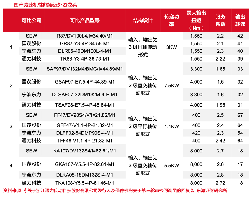 經(jīng)典案例:根據(jù)《關(guān)于浙江通力傳動科技股份有限公司發(fā)行人及保薦機構(gòu)關(guān)于第三輪審核問詢函的回復(fù)》、東海證券研究所等綜合資訊表明,2012年以來,國內(nèi)減速機技術(shù)快速發(fā)展,在產(chǎn)品性能上逐漸接近外資品牌,靜態(tài)參數(shù)如齒 輪比、扭矩、功率等基本達到相同水平。通過補足技術(shù)短板,內(nèi)資品牌產(chǎn)品硬實力逐漸提升,與渠道等軟實力形成共振,品牌認(rèn)可度逐年升高,不斷擠壓進口產(chǎn)品市場份額。