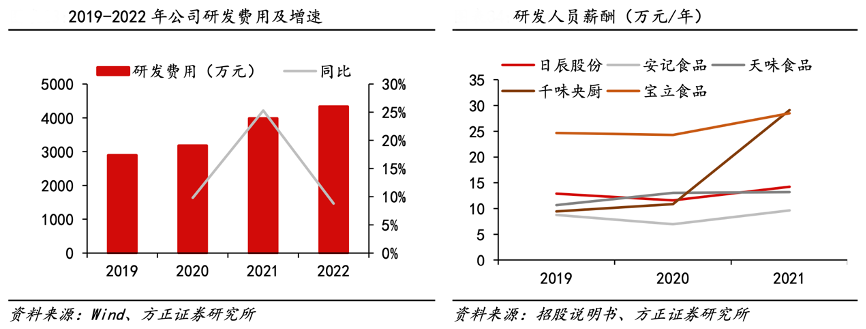 經典案例:根據wind、招股說明書、方正證券研究所等綜合資訊表明,寶立食品公司重視研發能力的培養,建立了完善的研發體系,并且注重對研發人員的激勵,研發人員薪酬在同行業公司中保持較高水平。作為研發驅動的食品風味及產品解決方案服務商,公司已積累大量配方數據,可在經典配方基礎上迭代創新,形成了強大的技術經驗壁壘。