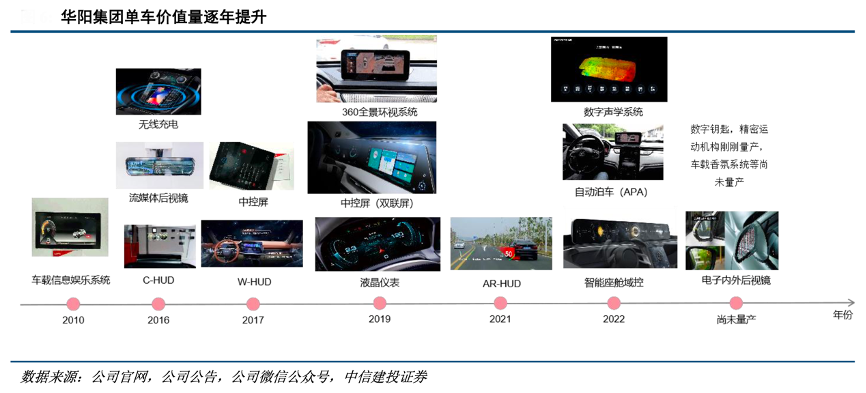 經(jīng)典案例:根據(jù)公司官網(wǎng)、公司公告、公司微信公眾號、中信建投證券等綜合資訊表明,從車機(jī)到中控屏/液晶儀表再到 HUD,座艙產(chǎn)品不斷拓展提升單車價(jià)值量。經(jīng)過持續(xù)的研發(fā),華陽公司在車機(jī)之后相繼推出新型智能化產(chǎn)品。2022 年華陽量產(chǎn)了智能座艙域控,實(shí)現(xiàn)了中控的升級,搭載于長城的哈弗 H6 和坦克 300。同年,華陽還量產(chǎn)了數(shù)字聲學(xué)、數(shù)字鑰匙和精密運(yùn)動機(jī)構(gòu)等產(chǎn)品。