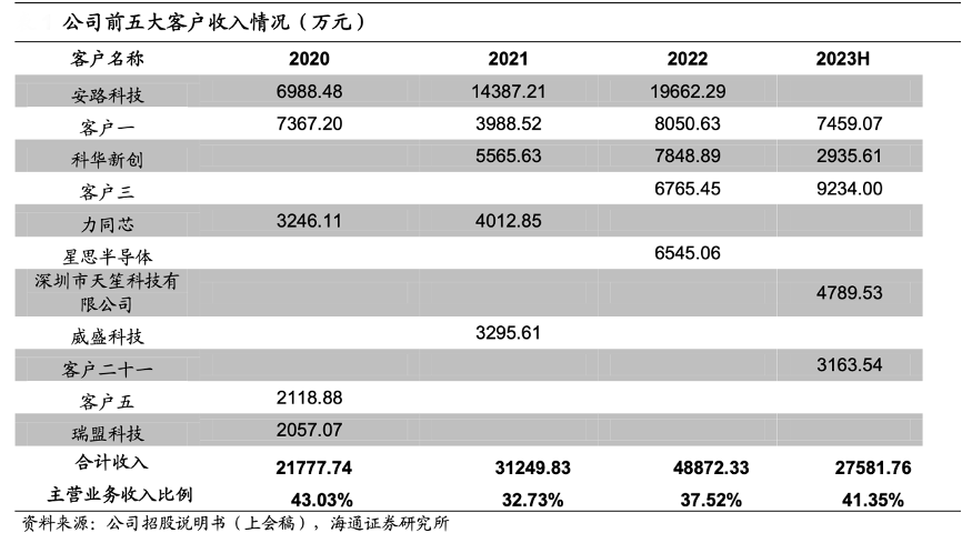 經(jīng)典案例:根據(jù)公司招股書(上會稿)、海通證券研究所等綜合資訊表明,燦芯公司目前已成功與安路科技、科華新創(chuàng)、力同芯、星思半導(dǎo)體等多家知名客戶 建立穩(wěn)定供應(yīng)鏈體系。2020-2023H1 公司前五大客戶收入占比為 43.03%、32.73%、 37.52%和 41.35%,前五大客戶收入占比維持較為穩(wěn)定。