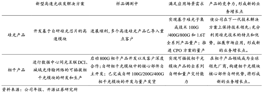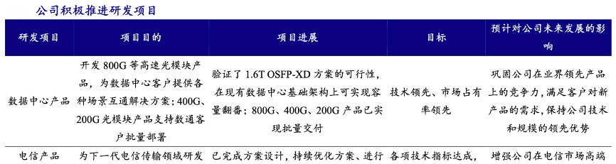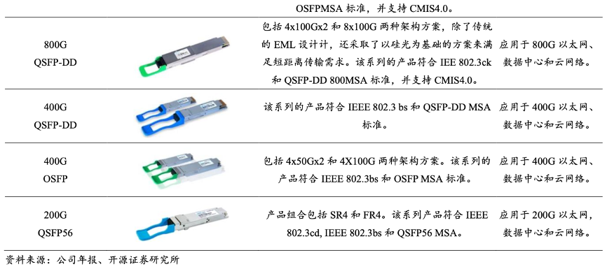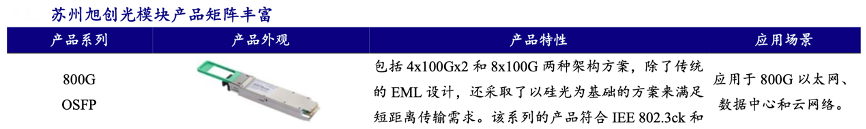 經(jīng)典案例:根據(jù)公司年報(bào)、開源證券研究所等綜合資訊表明,蘇州旭創(chuàng)致力于高端光通信收發(fā)模 塊的研發(fā)、設(shè)計(jì)、封裝、測試和銷售,產(chǎn)品服務(wù)于云計(jì)算數(shù)據(jù)中心、數(shù)據(jù)通信、 5G 無線網(wǎng)絡(luò)、電信傳輸和固網(wǎng)接入等領(lǐng)域的國內(nèi)外客戶。公司注重技術(shù)研發(fā),并推動(dòng) 產(chǎn)品向高速率、小型化、低功耗、低成本方向發(fā)展,為云數(shù)據(jù)中心客戶提供 100G、 200G、400G 和 800G 的高速光模塊。