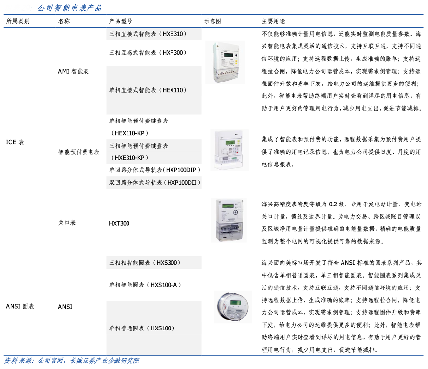 經(jīng)典案例:根據(jù)公司官網(wǎng)、長城證券產(chǎn)業(yè)金融研究院等綜合資訊表明,海興電力在產(chǎn)品類別方面,業(yè)務涵蓋 AMI 智能表、智能預付費電表、關口表等,具體可進一步分為包括單相電能表、三相 電能表、高精度表、預付費鍵盤表、分體式導軌表等細分產(chǎn)品,覆蓋不同應用領域,滿足各國不同電力客戶在電力計量產(chǎn)品方面的需求。