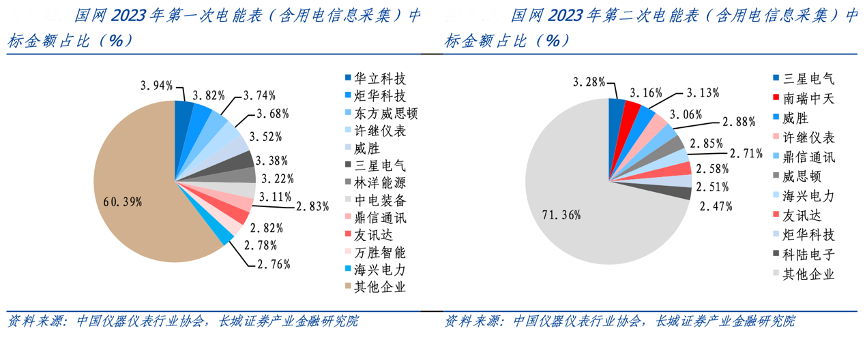 經(jīng)典案例:根據(jù)中國儀器儀表行業(yè)協(xié)會、長城證券產(chǎn)業(yè)金融研究院等綜合資訊表明,近年來,海興電力中標(biāo)率穩(wěn)定,公司在國網(wǎng)招標(biāo)中,單相智能表和三相智能表中標(biāo)量的市場份額分別維持在3%和5%左右。2023年,國網(wǎng)第二次電能表(含用電信息采集)中標(biāo)結(jié)果中,海興電力預(yù)中標(biāo)金額為 3.87 億元,市占率為 2.71%,為此次中標(biāo)金額前十名的企業(yè)之一。經(jīng)過多年發(fā)展,公司已經(jīng)穩(wěn)居國家電網(wǎng)電能表招標(biāo)第一梯隊。
