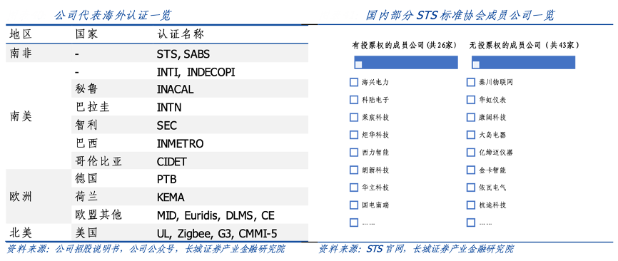 經(jīng)典案例:根據(jù)公司招股說明書、公司公眾號、STS官網(wǎng)、長城證券產(chǎn)業(yè)金融研究院等綜合資訊表明,海興電力獲得了多個國際認(rèn)證,其中包括 德國 PTB 認(rèn)證、歐盟 MID 認(rèn)證等各種國際常規(guī)認(rèn)證,是國內(nèi)最早成功研制 ANSI 美國標(biāo)準(zhǔn)系列產(chǎn)品的企業(yè)之一、是國內(nèi)最早成功研發(fā)歐洲智能電表標(biāo)準(zhǔn)的企業(yè)之一、也是我國獲得國際認(rèn)證較多的智能電表企業(yè)之一。同時,2017 年海 興參與全球工人的預(yù)付費系統(tǒng)開放標(biāo)準(zhǔn)——國際 STS 標(biāo)準(zhǔn)的制定,Vending 系統(tǒng)成功通 過 STS 認(rèn)證測試,成為國內(nèi)首家 STS 最新標(biāo)準(zhǔn)的 Vending 系統(tǒng)廠家,進(jìn)一步夯實了其在海外市場的美譽。