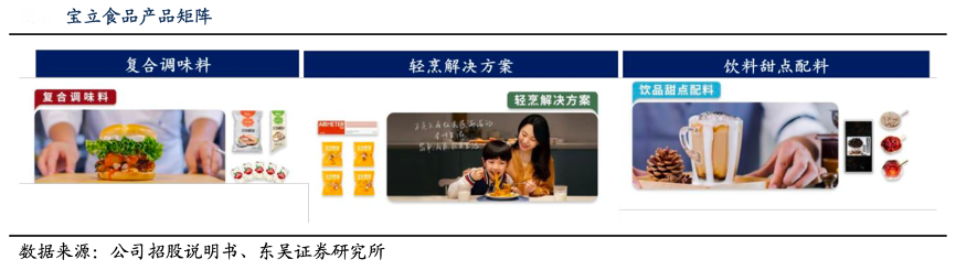 經(jīng)典案例:根據(jù)公司招股說明書、東吳證券研究所等綜合資訊表明,寶立食品公司深耕復合調(diào)味料領域多年,除復合調(diào)味料外,公司產(chǎn)品應用和類別逐步拓寬,推出各式風味的預烹飪料理包、預烹飪湯、空刻意面等輕烹解決方案以及果醬、爆珠、晶球和粉圓等多款飲品甜點配料。