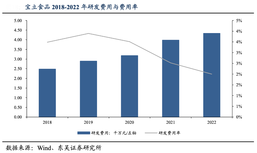 經(jīng)典案例:根據(jù)wind、東吳證券研究所等綜合資訊表明,寶立食品研發(fā)費用從 2018 年到 2022 年逐年遞增,公司重視研發(fā)新品增加投入,致力于擴充產(chǎn)品體 系,滿足 B 端客戶多樣需求,幫助提升產(chǎn)品多元性、制造差異、打造品牌競爭力。