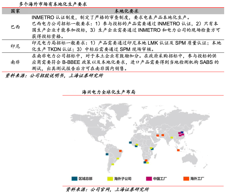 經(jīng)典案例:根據(jù)公司招股說明書、公司官網(wǎng)、上海證券研究所等綜合資訊表明,從貿(mào)易壁壘的設(shè)置來看,各地有很強(qiáng)的傾向鼓勵(lì)本地化生產(chǎn),如巴西和印尼直接要求本地化生產(chǎn),海興電力公司在海外市場(chǎng)深耕多 年,在全球范圍內(nèi)擁有多個(gè)工廠、子公司、辦事處,具備豐富的全球化管理和運(yùn)營(yíng)經(jīng)驗(yàn),短期內(nèi)競(jìng)爭(zhēng)對(duì)手難以復(fù)制。
