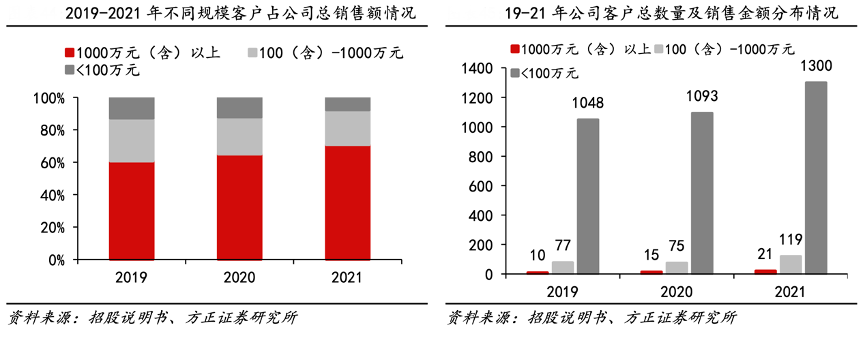 經(jīng)典案例:根據(jù)招股說明書、方正證券研究所等綜合資訊表明,從寶立食品客戶擴展數(shù)量來看,其大客戶(年銷售額 1000 萬元及以上)年均拓展 5.5 家,大客戶數(shù)量呈逐年上升趨勢,主要系公司基于對大客戶的服務能力及行業(yè)口碑,不斷拓展優(yōu)質(zhì)客戶的結(jié)果。該部分客戶銷售金額合計占公司主營業(yè)務收入的比例較高,各期均超過60%,集中度較高。