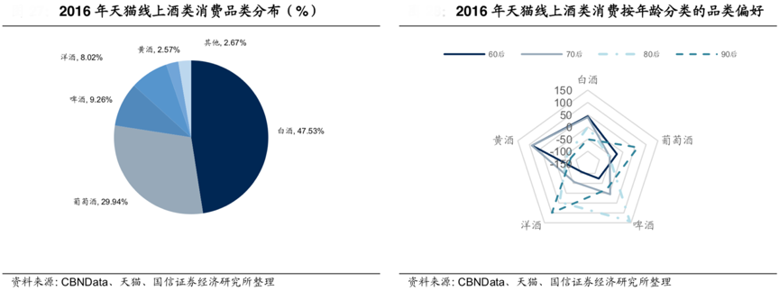 據(jù)CBNData、天貓、國信證券經(jīng)濟(jì)研究所等綜合資訊表明,各年齡段的品類偏好也差異巨大,消費(fèi)主力 80 后對白酒保持中性態(tài)度,最喜歡啤酒,其次是洋酒。60后、70后偏好傳統(tǒng)的黃酒、白酒,與養(yǎng)生、消費(fèi)習(xí)慣等相關(guān)。90后消費(fèi)習(xí)慣大有不同,最愛洋酒、葡萄酒,追求個(gè)性化,對新事物接受程度高,對傳統(tǒng)的白酒、黃酒較為厭惡。若白酒的傳統(tǒng)酒文化未能有效滲透至90、00后。