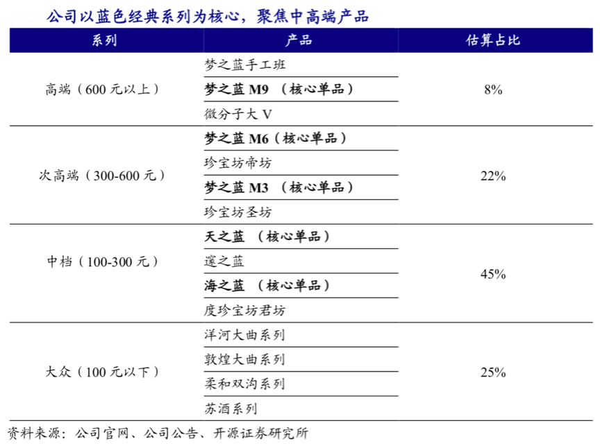 經(jīng)典案例:根據(jù)公司公告、公司官網(wǎng)、開源證券研究所等綜合資訊表明,洋河公司“多品牌矩陣”布局完整,形成了以洋河小海、柔和雙溝、洋河藍優(yōu)等為代表的大眾品牌,海之藍、天之藍、雙溝珍寶坊等為代表的中高端品牌,夢之藍M3、M6等為代表的次高端品牌,以及M9、手工班為代表的高端品牌。其中由海之藍、天之藍、夢之藍組成的藍色經(jīng)典系列是公司自 2003 年以來聚焦資源打造主推產(chǎn)品系列,目前占公司營收比重約 75%。