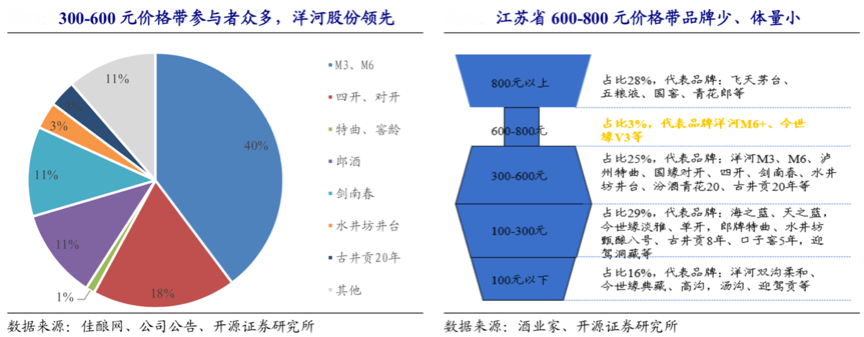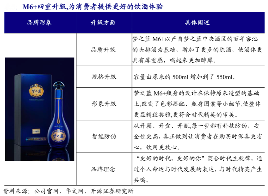 經(jīng)典案例:2019年洋河對產(chǎn)品線做出重要調整,推出 M6+,終端零售價格700 元左右,其篩選也核心經(jīng)銷商,聚焦團購市場,公司營銷資源進一步傾斜,做好 M6+消費者培育工作。根據(jù)公司公告、佳釀網(wǎng)、酒業(yè)家、華文網(wǎng)、開源證券研究所等綜合資訊表明,600-800 元價格帶是江辦省內消費即將要進入的價位段,洋河計劃2-3年將M6+打造成為50億級別單品。M6+成功可以拉升夢之藍品牌形象與價格天花板,打開夢之藍的成長空間。