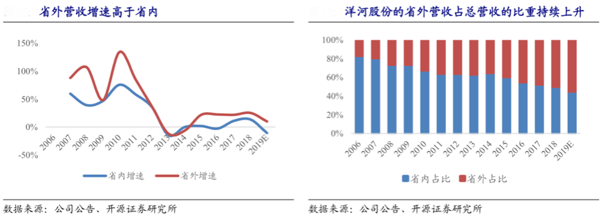 經(jīng)典案例:洋河公司運作區(qū)域市場,高度重視“區(qū)域內銷外銷雙市場”,省內市場做深做透,市占率逐步提升。根據(jù)公司公告、開源證券研究所等綜合資訊表明,公司在江蘇省內確立了南京和宿遷等重點戰(zhàn)略市場的領導地位之后,逐步向蘇州、無錫、徐州等地區(qū)擴張,完成了全省范圍內市場布局,并于2013 年,公司提出打造“新江蘇市場”的目標,將省外銷售超過800萬元的縣和超過1500萬元的市確定為“新江蘇市場”。現(xiàn)階段主要是開發(fā)新江蘇市場的“5+2”市場(“5”指上海、浙江、安徽、河南、山東,“2”指湖北和河北)。截至2019 年中,公司在全國共形成570個新江蘇市場,占省外銷售營收比重 70%以上。