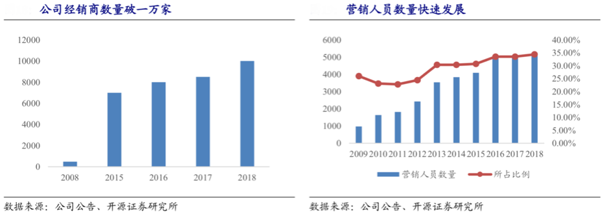 經(jīng)典案例:根據(jù)公司公告、開源證券研究所等綜合資訊表明,洋河股份率先采取經(jīng)銷商與廠商“1+1”共同運作市場的渠道模式,渠道結構上,渠道商、團購商、負責商超的經(jīng)銷商等多種經(jīng)銷商類型并存。洋河股份經(jīng)銷商數(shù)量從 2008 年的 475 家增至 2018 年超 10000 家。營銷網(wǎng)點從 2008 年 42 個增至 2018 年 316 個,輻射半徑逐漸從省、地市縮小至縣、鄉(xiāng)鎮(zhèn)范圍。2018 年洋河股份銷售人員數(shù)量超 5000 人,占總人員比例高達 34%,加上 35000 人的編外地推隊伍,銷售團隊人數(shù)位居行業(yè)第一。