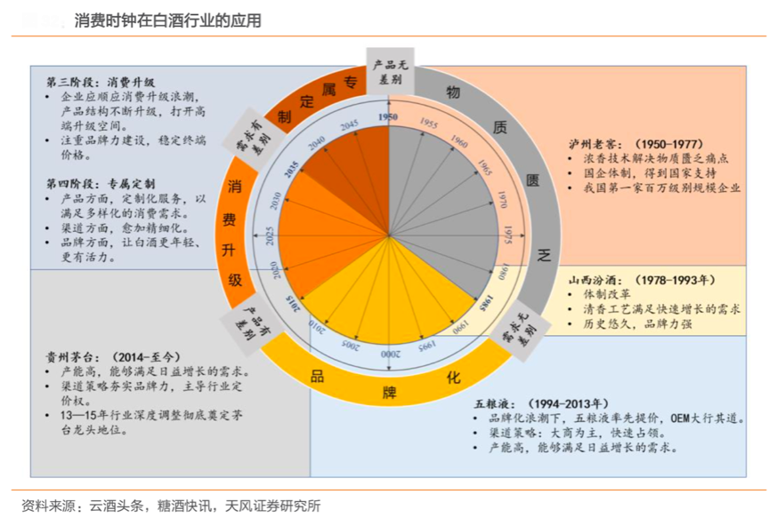 據(jù)云酒頭條、糖酒快訊、天風(fēng)證券研究所等綜合資訊顯示,“消費(fèi)時鐘”在白酒行業(yè)應(yīng)用廣泛,白酒行業(yè)已經(jīng)從物質(zhì)匱乏、品牌化階段發(fā)展到消費(fèi)升級及專屬定制的階段,高端白酒消費(fèi)的個性化和主題化日益增強(qiáng),基于團(tuán)體消費(fèi)定制、區(qū)域白酒文化定制等白酒消費(fèi)服務(wù)的市場日益擴(kuò)大。