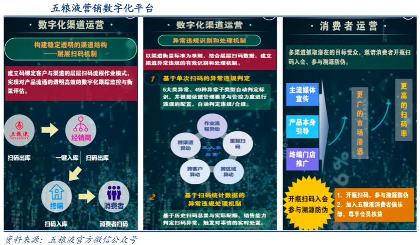 經典案例:據五糧液官方公眾號及華創證券等綜合資訊表明,其于2017年與 IBM 建立深度合作,建立起了積分掃碼系統,幫助公司掌握打款下單、倉儲物流和銷售等重要營銷節點的數據。2019 年進一步構筑全渠道互聯網、大數據營銷決策平臺,并于2019 年 6 月上線“消費者俱樂部”微信終端,提供會員增值服務、加強消費者互動,以消費者運營引導數字化渠道運營,建立良好的數字營銷管理前后臺聯動機制。