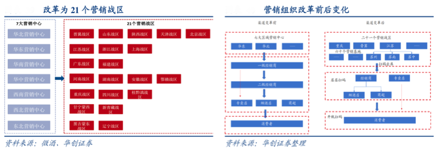 經典案例:據徽酒、華創證券等綜合資訊顯示,2019 年 2 月,五糧液繼續深化渠道改革,將原有的 7 個 營銷中心改為 21 個營銷戰區,繼續市場下沉。本次營銷中心變革的核心為:將中心制轉變為營銷戰區制,以省為基礎,以市場容量、市場潛力、競爭態勢三個維度,構建單省營銷戰區或多省合一的營銷戰區。