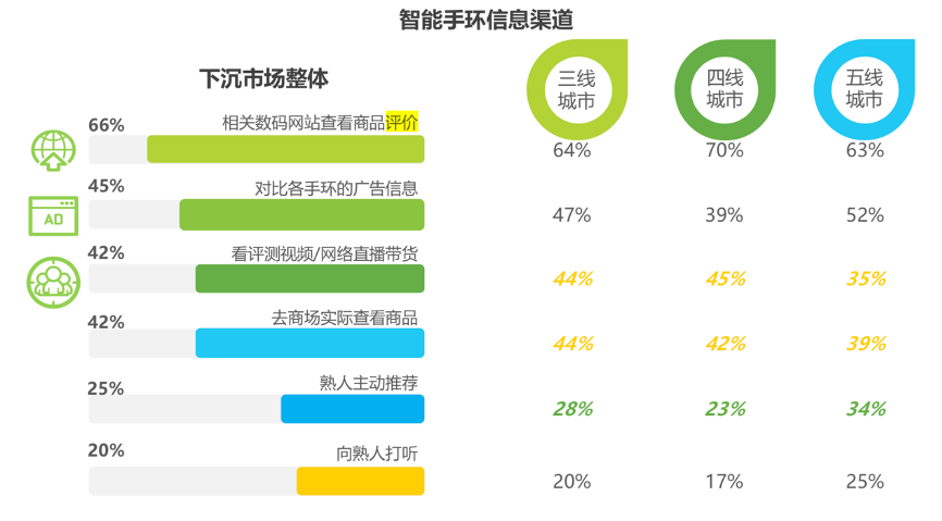 經典案例:根據《20210513-艾瑞咨詢-科技行業“下沉”專題系列報告》等綜合資訊表明,垂直網站的商品評價、廣告信息和評測視頻是下沉市場了解智能手環商品信息的主要渠道。