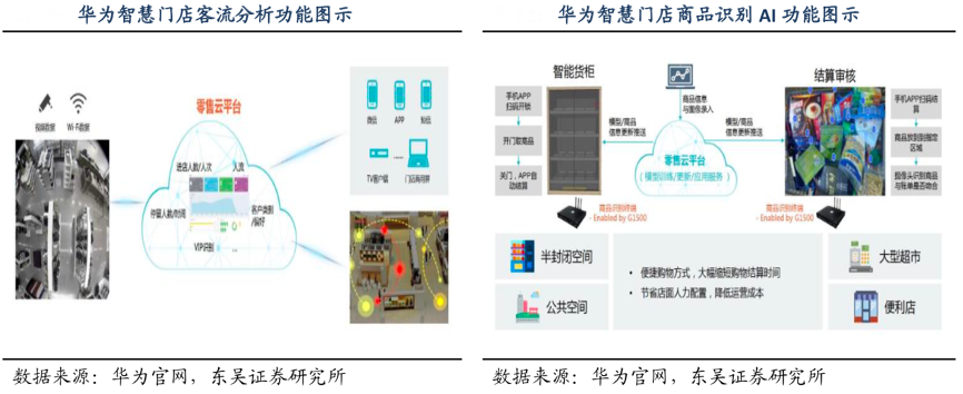 經典案例:根據華為官網、東吳證券研究所等綜合資訊表明,“AI+視頻”扮演重要角色,其通過人臉識別、人形檢測、行為分析、物體識別等技術,伴隨客戶進店、逛店。用戶進店后,零售云平臺捕捉其在店內的動線及行為軌跡被智能攝像頭及人臉識別技術捕捉,錄入后臺數據庫并分析用戶偏好、停留熱區, 從而進行后續精準營銷、店面布局優化。在逛店環節,可通過智能手推車、智能貨柜、 刷臉識別等方式簡化結賬流程,提升坪效。