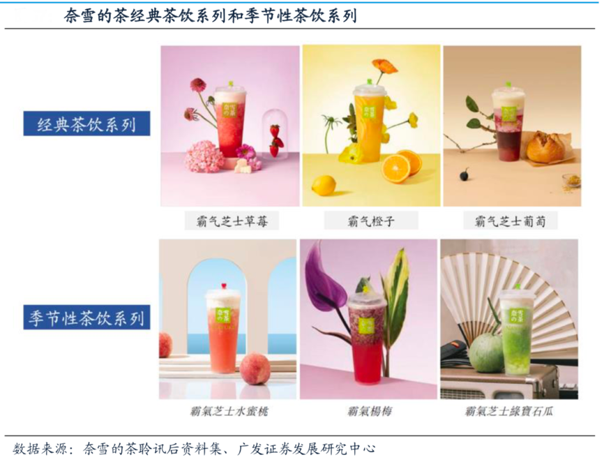 經典案例:根據奈雪的茶聆訊后資料集、廣發證券發展研究中心等綜合資訊表明,奈雪的茶產品組合大致可以分為“經典爆款單品+季節性茶飲+定期上新+跨界聯名”,經典爆款單品和季節性茶飲是銷量基礎,定期上新和跨界嘗試吸引復購+保持品牌熱度。根據公司聆訊后資料集,2020年從訂單量來看三大最暢銷的經典茶飲為霸氣芝士草莓、霸氣橙子和霸氣芝士葡萄,共售出超過2180萬杯,其中霸氣芝士葡萄訂單總數達600萬杯,三大暢銷經典茶飲占現制茶飲銷售額的27.6%。