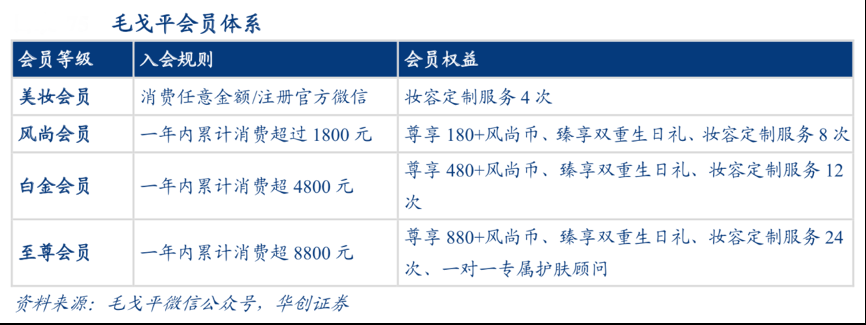經典案例:根據毛戈平微信公眾號、華創證券等綜合資訊表明,毛戈平注重會員管理,顧客忠誠度極高。其會員體系分為美妝會員、風 尚會員、白金會員和至尊會員四個等級,2015 年毛戈平至尊會員(12 個月內累計消費8800 元)復購率高達 68.38%(指復購品牌旗下產品)。