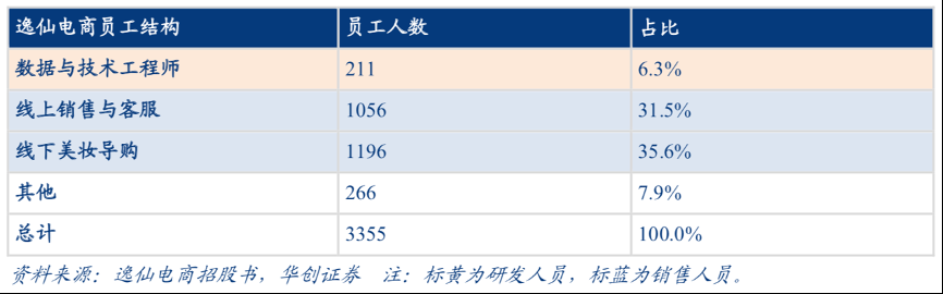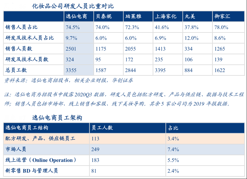 經典案例:根據逸仙電商招股書、相關企業財報、華創證券等綜合資訊表明,截止 20Q3,逸仙電商技術團隊擁有 211 名數據與技 術工程師, 113 名產品與供應鏈研發人員,以及 1056 名線上銷售客服/1196 名線下 BA, 銷售與研發人員均高于行業平均水平。結合招股書披露數據,逸仙電商公司技術團隊開發一系列內部系統(包括KOL 管理系統、“小完子”微信后臺以及實時大數據后臺),與阿里云與騰訊均有合作。技術人員除了負責用戶界面平臺設計外,將市場趨勢、KOL 內容以及社交平臺用戶行為數據分析處理,指導產品研發、廣告投放等運營決策。