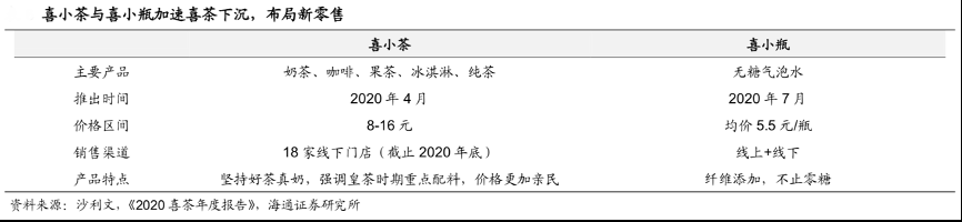 經(jīng)典案例:根據(jù)沙利文、《2020喜茶年度報(bào)告》、海通證券研究所等綜合資訊表明,喜茶 2020 年 7 月推 出喜小瓶,以更多“瓶裝靈感”提供“纖維添加,不止零糖”的無(wú)糖氣泡水產(chǎn)品。2020 年,喜茶天貓旗艦店共賣出喜小瓶氣泡水約 140 萬(wàn)瓶,京東自營(yíng)旗艦店共售出 50 萬(wàn)瓶, 天貓雙十一期間,喜小瓶氣泡水類銷量超 4 萬(wàn)箱 50 萬(wàn)瓶,位列網(wǎng)紅氣泡水 TOP3。