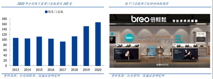 經典案例:根據公司公告、國盛證券研究所等綜合資訊表明,倍輕松公司線下直營門店定位為品牌宣傳和為線上門店引流,截至 2020 年末,其直營門店數累計達 165 家,其中機場高鐵店比例高。一方面,重要交通樞紐客流量大,有助于提升品牌知名度。另一方面,便攜按摩器具為重體驗的小家電,樞紐店為商旅客群提供了可在候機、等高鐵的碎片化時間進店體驗產品的的場所。2018~2020 年,線上銷售收入占比由 33.70% 提升至 52.27%,線下銷售由 57.22%降至42.23%。