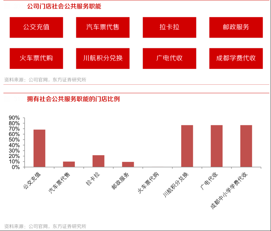 經(jīng)典案例:根據(jù)公司官網(wǎng)、東方證券研究所等綜合資訊表明,紅旗連鎖門店在銷售產(chǎn)品之外,還承擔(dān)了多項(xiàng)社會(huì)公共服務(wù)職能,其中包括公交充值、汽車票代售、、拉卡拉、郵政服務(wù)、火車票代購(gòu)、川航積分兌換、廣電代收、成都中小學(xué)學(xué)費(fèi)代收。紅旗連鎖與當(dāng)?shù)厣鐣?huì)公共服務(wù)職能實(shí)現(xiàn)深度綁定,進(jìn)一步強(qiáng)化了公司門店的不可替代性,高度融入居民日常生活也能深化公司的品牌形象,鞏固公司的競(jìng)爭(zhēng)壁壘。
